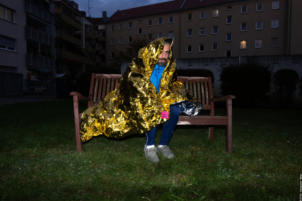 Die Rettungsdecke steht dabei nicht nur für Schutz und Wärme, sondern erinnert auch an die