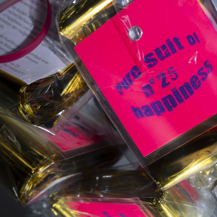 Die limitierte Auflage umfasst 200 konfektionierte Rettungsdecken, jeweils inZellophantütchen verpackt und ergänzt mit einem pinken Kabelbinder zum Fixieren.Seit 2003 präsentiert die Künstlerin ihre textilen Arbeiten unter diesem Kunst-Markennamen.Der Name spielt auf den in der amerikanischen Unabhängigkeitserklärung vom 4. Juli 1776garantierten Begriff pursuit of happiness an, […]